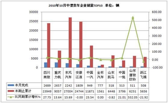 2010年10月货车生产226321辆,累计生产2316989辆,销售225518辆,累计销售2340638辆,同比累计增长分别为22.59 %和26.18 %。