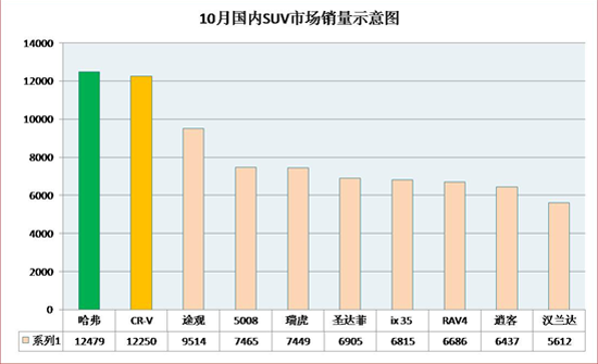 10月,SUV市场销量虽然出现小幅下滑,但整体形式和格局基本保持稳定,哈弗SUV、CR-V、途观等老面孔依然占据着销售排名前列,哈弗SUV超越CR-V,以12479辆的成绩再次夺得月度销售冠军,途观继续保持了旺盛的销量态势,9514的销量保证了其在SUV细分市场的第一阵营。