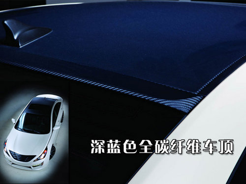 轻量化处理是改装车的重点,这辆SEMA版索纳塔车顶采用全碳纤维材料打造。与我们一般所见的灰色碳纤维不同,这台索纳塔的车顶碳纤维为诡异的深蓝色,时刻透露着神秘的运动气息。