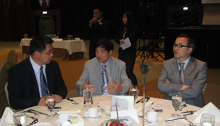 VNU亚洲展览集团仲刚(右)与UITP 总裁Alain Flaush (左) 和BAAV总秘书长 Patrick Van Impe (中)商讨有关合作。