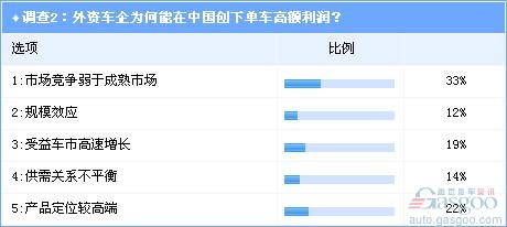 在调查2(见图2)中,针对五项影响因素,其中“市场竞争弱于成熟市场”得到33%人士的投票认可,可见市场竞争不充分依旧是导致现有利润外流局面发生的最大因素;同时,中高端市场被外资品牌长久把持,单车利润更为丰厚的中高级车和豪华车为外资车企创造了数以百亿计的巨额利润。这一点可以从“产品定位较高端”这一影响因素得到的22%的投票率窥见一斑;值得关注的是,中国市场的高速增长从而带动起来的庞大消费群体,则是外资车企利润积聚的非常给力的促成因素,在调查2 中我们可以看到,“受益车市高速增长”以及“规模效应”这两大因素的投票率亦不在少数,各为19%和12%。此外,“供需关系不平衡”获得的投票率为14%。