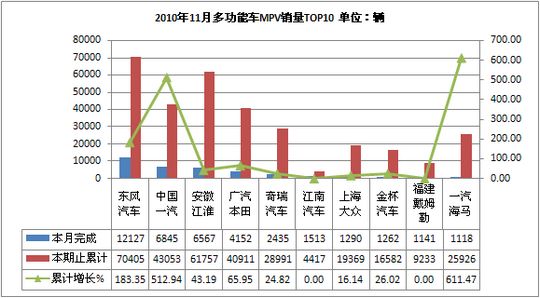 2010年11月多功能车生产42307辆,累计生产400298辆,销售42115辆,累计销售396316辆,同比累计增长分别为83.29%和82.09%。