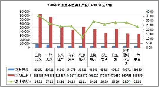 2010年11月基本型轿车生产941784辆,累计生产8570531辆,销售933897辆,累计销售8573504辆,同比累计增长分别为29.81%和28.94%。