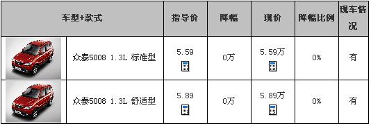 笔者从众泰汽车福州厂家直营店了解到,该店推出贺“税” “油” “礼” 三重礼活动,现在购买众泰汽车5008系列的客户,可享受三重礼,详情如下:一重礼:贺税礼,活动期间购车用户,均可享受汽车2.5%购置税礼包;二重礼:油礼,活动期间购车用户,均可享受购车油礼(价值1000元);三重礼:迎春礼,成功购车者,可获得经销商提供的贺岁装潢大礼包(价值1000元)。厂家指导车型及价格见下表: