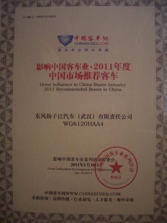 元月10日,从北京传来喜讯,在“第五届影响中国客车业系列活动”中,扬子江WG6120型混合动力城市客车喜获“2011年度中国市场推荐客车奖”。国内混合动力客车获得此项殊荣的仅此一款。同日,东风扬子江城市客车研究院院长雷洪钧博士著写的《扬子江纯电动公交车应用及产业化》获得“影响中国客车业·优秀论文”奖。