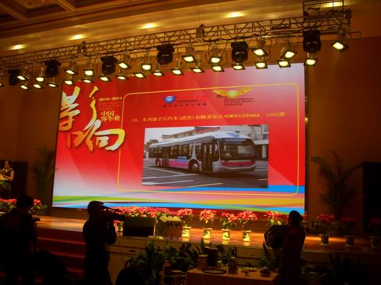 颁奖会现场,大屏幕上展示 的获奖的扬子江混合动力客车
