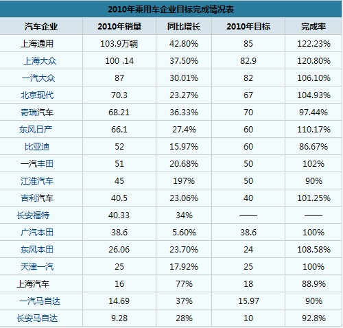 近期中国汽车工业协会公布了2010年汽车销量数据,从最终统计结果来看,2010年几乎所有的汽车厂商都赚得盆满钵满,年度销售目标也几乎超额完成,即使有少数不能完成目标的厂家,也能完成八九成,表现较为良好。但有趣的是,已经到了2011年年初,很少有厂家谈及自己在2011年的目标,这其中包含对未来一年车市预期的谨慎,毕竟失去了多项有力政策的支持,谁能知晓2011年车市到底走向何方。本文对各个车企在今年的表现做个盘点,并对它们在 2011年的走势做些预测。