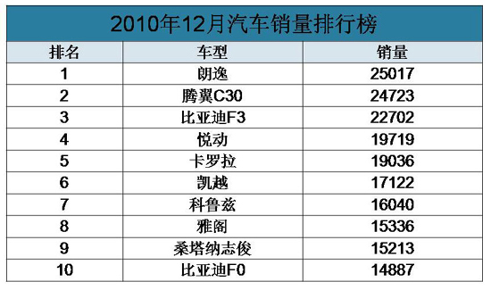 近日,中国汽车工业协会发布数据,2010年汽车产销分别达到1826.47和1806.19万辆,同比分别增长32.44%和32.37%,刷新全球历史纪录。其中,狭义乘用车产销量分别为118.21和126.13万辆,同比增长20.0%和27.5%。此外,长城汽车力推的全球战略车型腾翼C30销量达到24723辆,环比增长达99.48%,跃身轿车销量排行榜第二名,仅距离排名第一的朗逸一步之遥。