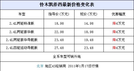 近日,编辑从北京地区长安铃木4S店获悉,铃木中国为广大喜爱铃木品牌,热衷体验驾驶乐趣的客户带来一份新春大礼。凯泽西全系车型现金让利高达四万。如此实惠的价格,大大提高了这款进口四驱轿车的性价比。据悉,本次优惠活动于1月1日~3月31日期间进行,凡在此期间购买凯泽西的客户,通过铃木中国官方网站活动页面注册成功以后即可轻松获得价值4万元的凯泽西购车现金优惠资格。具体详情可电话咨询相关经销商。
