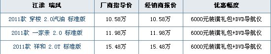 近日,编辑从沪上江淮4S店了解到,岁末江淮瑞风全系购车赠6000元装潢大礼包和DVD导航仪,并且全系车源较充足无需预订。具体装潢礼包需到店详询。具体优惠如下: