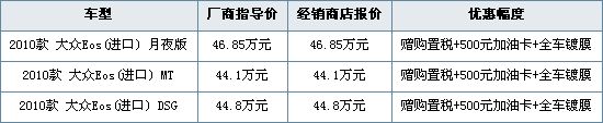 编辑从华日菱进口大众4S店获悉,目前订购EOS即可赠送购置税、500元加油卡和全车镀膜,优惠截止至1月末,详情请见下表: