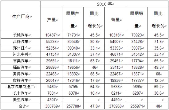 从分月的销量分析,皮卡行业2010年全年均曾现出稳步增长的趋势,其中12月份达到销量顶峰,其余月份实现平稳增长,各月销量变化与汽车行业总体市场表现基本一致,说明皮卡车今年市场表现稳健,曾现比较良好的发展局面。