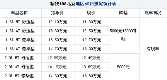 近日,爱卡汽车编辑从北京地区东风标致经销商处了解到,东风标致408现车销售,1.6L车型优惠8000元(含3000元补贴),2.0L车型优惠5000元。详情请见下表: