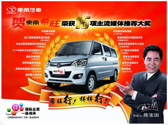 刚刚过去的2010年,是东南汽车在商用车领域跨越的一年。全新微客东南希旺在第八届广州车展启动全国市场预接之后,迅速在高效动力、高品质、高承载等方面树立起了良好的口碑,并取得了优异的市场成绩。不仅如此,在2010年各大媒体举办的车坛年度颁奖盛典中,东南希旺获得来自全国媒体的认可,接连荣获15家全国主流媒体颁发的“最佳年度微客”、“ 最值得期待的微型商用车”、“最受欢迎微型车”等诸多大奖。