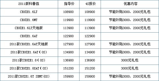 今日小编在合肥环雪雪佛兰4S店了解到,,店内为庆贺新年推出新年全系车型购车优惠套餐活动,凡购买雪佛兰科鲁兹均享受补贴3000送和2000礼包,详情请见下表: