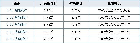 小编从上海长安铃木4S店了解到,两厢时尚小车雨燕目前在上海可享受7000元现金优惠和价值3000元的装潢大礼包,累计优惠近万元。目前展厅内现车充裕,有兴趣的网友可以到店详谈。具体优惠明细如下: