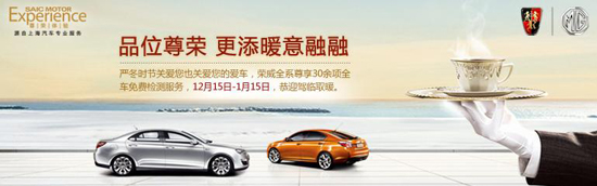 冬季行车安全向来是车主和家人们比较关心的问题,而在雨雪季来临之前对车辆进行全面检查和保养则是确保行车安全的一个重要步骤。据了解,上海汽车荣威推出的“2010尊荣体验冬季免费检测”活动主要以提升服务品质为目标,为车主贴心提供30余项全车免费检测服务,更以专业精诚的态度为爱车悉心调校养护,让爱车在朔冬之际也能畅行无阻。