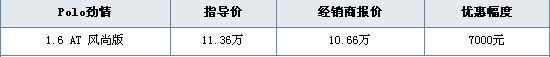 目前,编辑从北京地区上海大众经销商了解到,目前老款POLO劲情享受3000元惠民补贴并有全系6000现金优惠。具体情况如下: