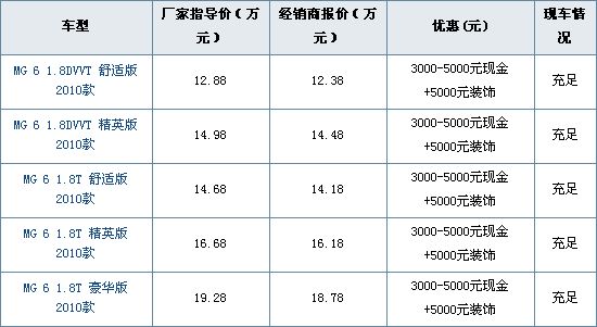 价格波动:价格方面,自上市以来MG6并无较大的优惠,目前,非世博版MG6红色车型可享5000元现金优惠及5000元的装饰大礼,相比去年年底非世博办全系车型的5000元优惠幅度有所减小,感兴趣的朋友可以到店内进行详细咨询。