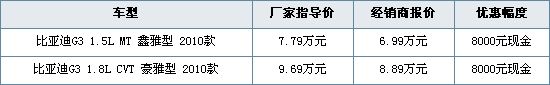 近日,编辑从比亚迪汽车广州地区经销商处获悉,新年伊始,购买比亚迪G3将继续拥有8000元现金优惠,感兴趣的朋友可致电或到店详询。具体情况如下表: