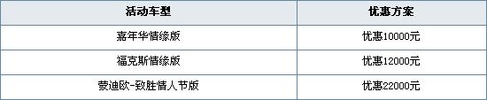 编辑获悉,2月12日-14日,福建丰吉福特推出“情人节赏车会”。其中活动期间推出的嘉年华情缘版优惠10000元;福克斯情缘版优惠12000元;蒙迪欧-致胜情人节版最高优惠22000元。