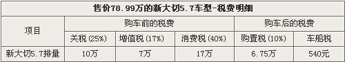 看过小排量国产车型的税费后,再以售价78.99万元的新大切5.7排量车型为例,看看大排量进口车的相关税费组成。由于新大切是进口车型且排量为5.7升,所以这款新大切车型需缴纳10万元左右的关税,以及40%的消费税约为17万左右。除此之外,还需缴纳6.75万元的购置税和540元的车船税。由此可知,78.99万元的新大切车型的税费总和约为41万元,约占车价的52%。
