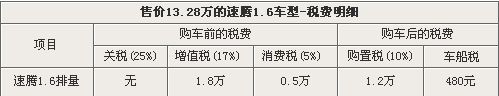 以售价为13.28万元的一汽大众速腾1.6排量车型为例,由于是国产车型且排量为1.6升,所以这款速腾车型无关税且消费税按照裸车价的5%来计算,约为0.5万元左右。而购置税是按照包含消费税的厂家指导价来计算,为1.2万元左右。由此可以看出,13.28万元的速腾车型的税费总和约为3.5万元,约占车价的26%。