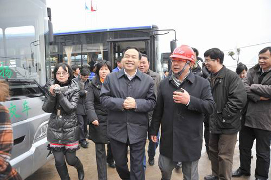 参观过程中,东风扬子江总经理向各位来访领导介绍了公司近期的发展情况,目前公司的研发及销售主要以公交车为主,产品远销海外,并得到了孟加拉、泰国、缅甸等地客户的喜爱和好评。其间,代市长唐良智表示,如今纯电动车项目的产业前景可观,东风扬子江应抓紧机遇大力发展纯电动车整车、电池、电机、电控的研发,并形成产业链,将公司做大、做强。