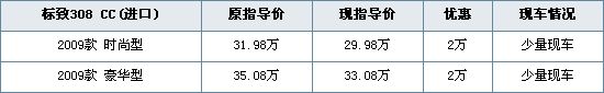 今日,编辑从深圳标致经销商处了解到,标致中国近日对308CC两款车型市场指导价均下调2万,调整后308CC时尚型指导价已下探至30万以下,感兴趣的朋友可以到经销商处详询。具体价格见下表:
