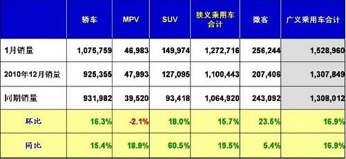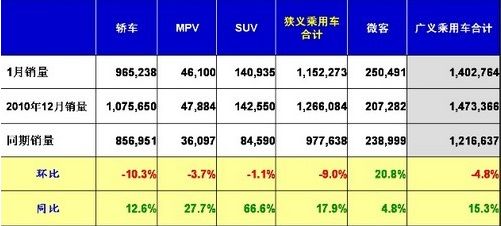 2011年2月14日,全国乘用车市场信息联席会(以下简称“乘联会”)公布的最新统计数据显示,2011年1月,国内狭义乘用车(不含微客)产量为116.83万辆,与去年同期相比增长了17.2%,与上月相比则下降2%;国内销量为115.23万辆,同比增长17.9%,环比下滑9%。