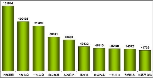 今年1月,国内销量排名前十的汽车生产商依次为上海通用131944辆、上海大众100108辆、一汽大众91288辆、北京现代68811辆、东风日产63363辆、比亚迪49432辆、奇瑞汽车46113辆、一汽丰田45199辆、吉利汽车44372辆和长安福特马自达41732辆。