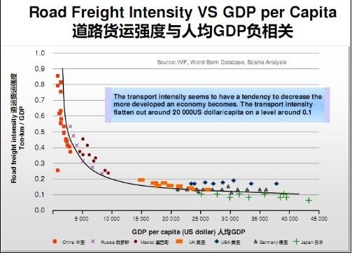 很多人都认为,随着中国GDP的增长,中国的货运总量会持续增长,从而带动重卡销量持续上涨。至少前十年的经验充分证明了这一点。但是,根据发达国家的经验,货运强度并不是随着GDP的上涨而一路上涨的。根据斯堪尼亚集团中国战略中心首席代表何墨池在去年年底演讲中引用的下面的研究报告结论可以看出,随着GDP的上升,货运总量反而下降。