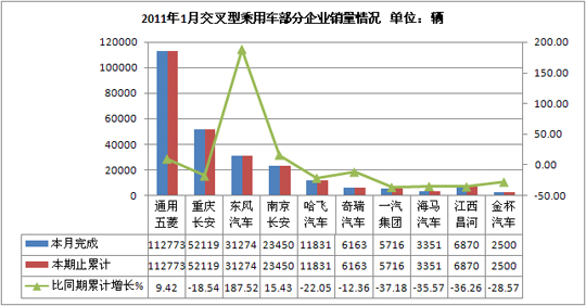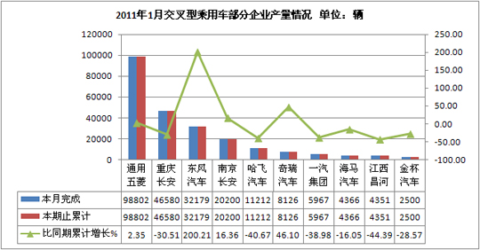 2011年1月交叉车型生产241497辆,累计生产241497辆,销售262862辆,累计销售262862辆,同比累计增长分别为-1.69%和4.22%。