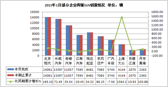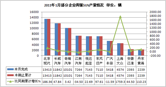 2011年1月两驱运动型多用途车生产80662辆,累计生产80662辆,销售86046辆,累计销售86046辆,产销同比累计增长分别为37.38%和49.69 %。