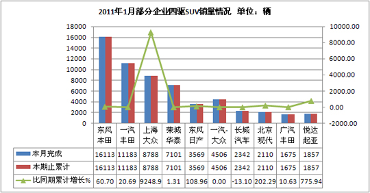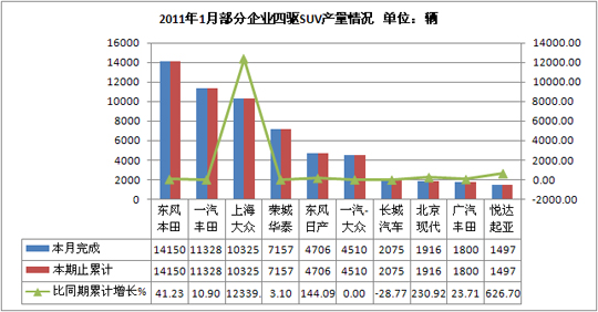 2011年1月四驱运动型多用途车生产63004辆,累计生产63004辆,销售62447辆,累计销售62447辆,同比累计增长分别为64.29%和68.89%。
