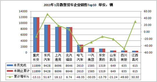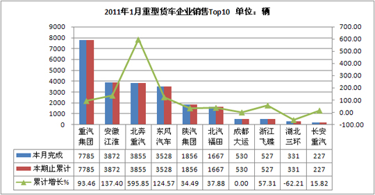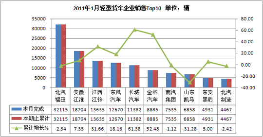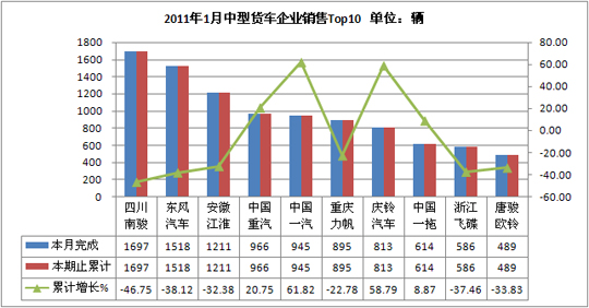 2011年1月货车生产259539辆,累计生产259539辆,销售239540辆,累计销售239540辆,同比累计增长分别为5.61%和5.49%。
