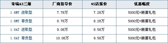 近日,编辑从申城奇瑞4S店了解到,紧凑型家轿奇瑞A3全系购车优惠现金5000元,全系有现车。除此以外,购车再赠装潢礼包,具体礼包到店洽谈。详细优惠明细如下: