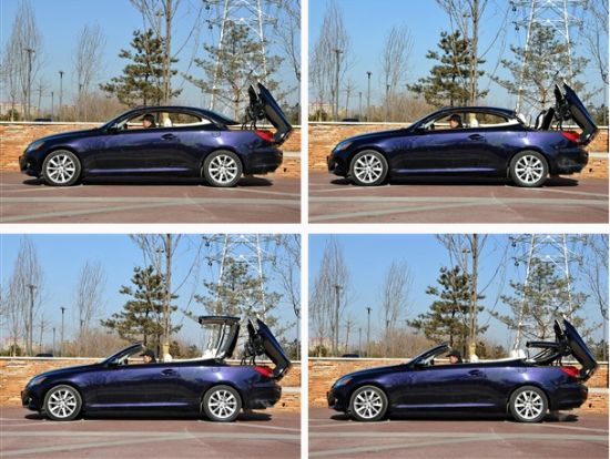长按方向盘左侧的车顶开关,IS300C这套三片式的可收放硬顶可以在21秒内完全开启,整个过程非常流畅,豪华感尽显。