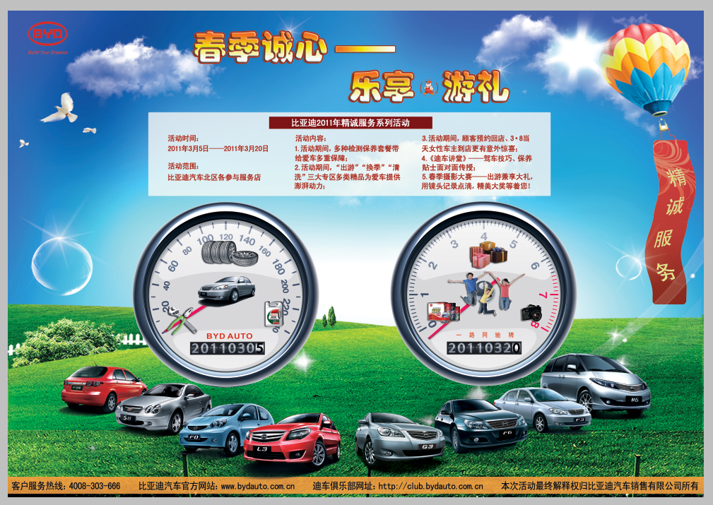 比亚迪自进入汽车行业以来,一直秉承“五心服务”理念,以敏锐的目光洞察市场的变化,以先人一步的服务理念紧跟市场的步调,不断改进服务方式,提升服务水平,力求给予顾客更加细致、贴心、完善的服务。此次比亚迪汽车“春季诚心 乐享游礼”2011年四季关怀精诚服务系列活动无疑将使售后服务再度升级,让比亚迪车主在春季伊始感受到实实在在的关爱和温暖。