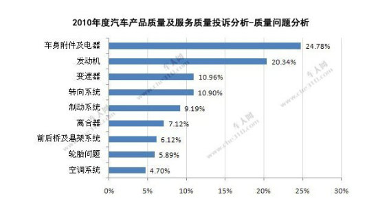 3.质量问题投诉中,车身附件及电器问题占比最高,其次是发动机故障,截止今年2月下旬,发动机、车身附件的投诉相比2010年分别增加了5%和3.5%,说明车主对发动机这样的重要部件关注度依然很高,并且对驾乘的舒适度提出了更高要求。