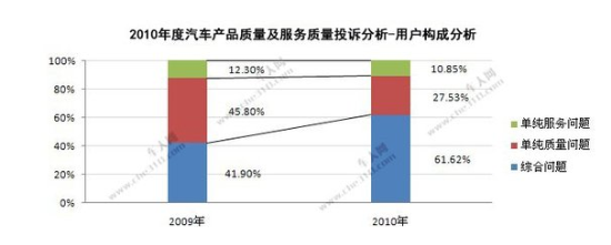 与去年同期相比,用户投诉构成格局发生很大变化,综合问题投诉(同时投诉质量和服务问题)上升十分显着,2011年截止到2月下旬,综合问题仍是居高不下。导致这一变化的重要原因是在维修过程中,因服务态度差、维修效率低、更换配件久等屡屡发生,用户严重抱怨。综合全年收到的投诉反馈,重大质量问题所占比例很少,多数投诉集中在常见故障上。车主普遍希望服务站能针对车辆故障认真检查,高效彻底的解决。