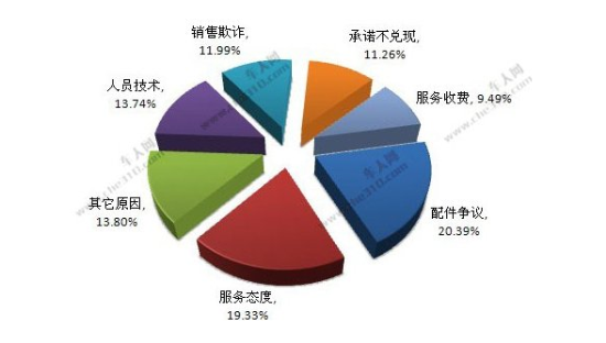 在服务问题投诉中,更换配件引发争议最大,其中又以配件供应时间过长居多;其次是服务态度,多数是车主认为维修站态度冷漠,对于车辆存在的问题不予重视、认真检查或对于车主的疑问不能给予专业的解释和说明等;承诺不兑现则多是指已承诺配件更换甚至承诺日期但却迟迟不能到货等。