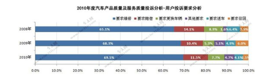 “把车修好”仍是车主最主要的要求,占到69.5%;其次就是“要求赔偿”,主要是要求赔偿多次往返维修站的交通费、误工费还有车主认为不合理的维修费用等;“其他要求”的增长也较为显着,分析显示,这其中包括有要求延长车辆或部件的免费保修期、要求提供修车期间的代步车辆、要求商家或服务站人员因态度差而道歉等,可见车主越来越重视和维护自身各方面权益。