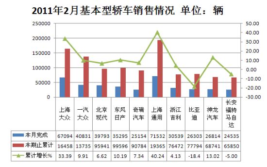 2011年2月基本型轿车生产662614辆,累计生产1626953辆,销售633657辆,累计销售1704104辆,同比累计增长分别为9.83%和9.71%。