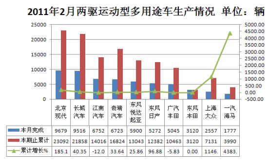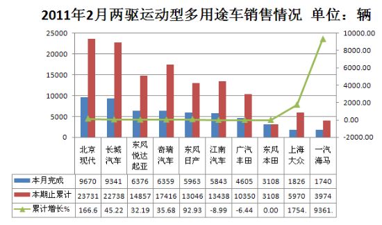 2011年2月两驱运动型多用途车生产64205辆,累计生产145378辆,销售62668辆,累计销售148719辆,产销同比累计增长分别为50.17%和50.87%。