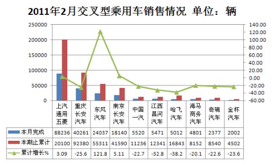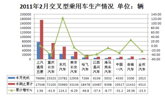 2011年2月交叉车型生产171674辆,累计生产413936辆,销售199002辆,累计销售461864辆,同比累计增长分别为-9.01%和-3.09%。