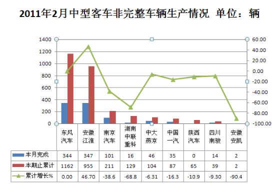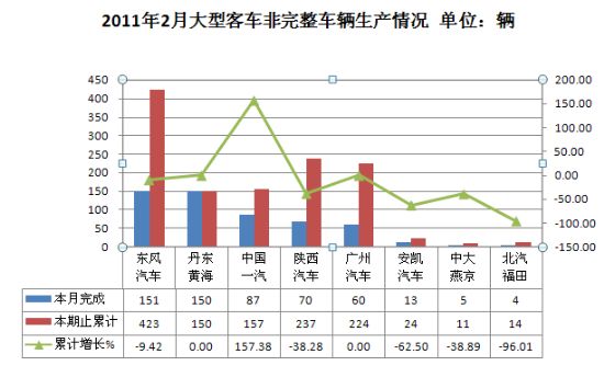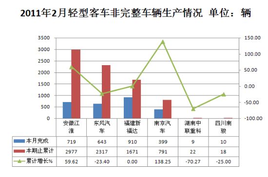 2011年2月客车非完整车辆生产3658辆,累计生产10560辆,销售4135辆,累计销售11790辆,同比累计增长分别为6.86%和20.31%。