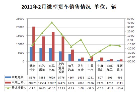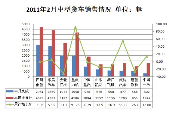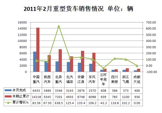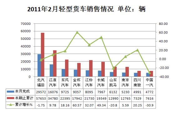 2011年2月货车生产200191辆,累计生产467769辆,销售208290辆,累计销售441939辆,同比累计增长分别为9.25%和11.21%。
