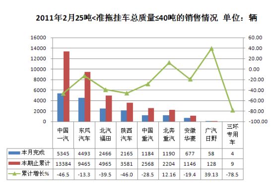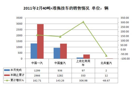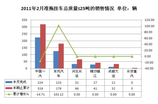 2011年2月半挂牵引车生产19400辆,累计生产45750辆,销售20340辆,累计销售42705辆。
