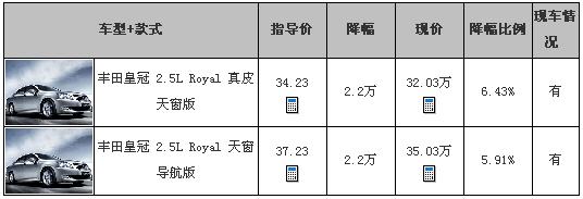 编辑从上海地区的一汽丰田4S店了解到,丰田新皇冠2.5L V6车型目前在店内有部分现车,但是皇冠最近的优惠力度不大。据店内工作人员介绍,新皇冠2.5L V6真皮天窗版和天窗导航版的现金优惠为2.2万元,其他优惠可以到店后面谈。